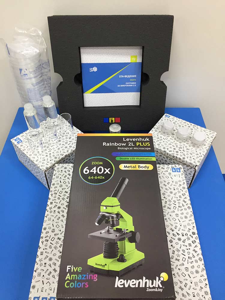 Комплект «Охотники за микробами 2.0» состоит из микроскопа Levenhuk Rainbow 2L PLUS , книги знаний «Невидимый мир» , аксессуаров для проведения научных опытов и методических материалов. Он будет поставляться в школы для проведения уроков биологии. Комплект позволяет провести два полноценных занятия длительностью 45 минут со школьниками 6–7 классов. Благодаря «Охотникам за микробами 2.0» юные исследователи узнают, как пользоваться микроскопом, изучат микроскопических обитателей пресных вод, познакомятся с анатомическим строением животных и растительных клеток.