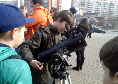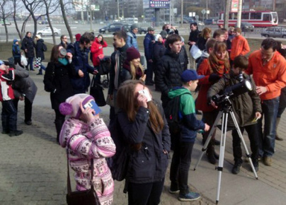 20 марта счастливчики стали свидетелями одного из самых ожидаемых астрономических событий 2015 года – солнечного затмения. На территории нашей страны мы наблюдали частное солнечное затмение: Луна закрывала диск Солнца не полностью. Люди наблюдали отовсюду – с улицы, из окна офиса, за рулем, за онлайн-трансляциями в Интернете. А мы, сеть магазинов оптической техники «Четыре глаза», выставили телескопы с солнечными фильтрами около магазинов в Москве, Петербурге, Екатеринбурге, Воронеже, Липецке, Саратове, Ижевске, Челябинске, Перми и других городах и предлагали всем желающим совершенно бесплатно понаблюдать затмение в телескоп. В Петербурге удалось понаблюдать даже в солнечный телескоп Coronado.